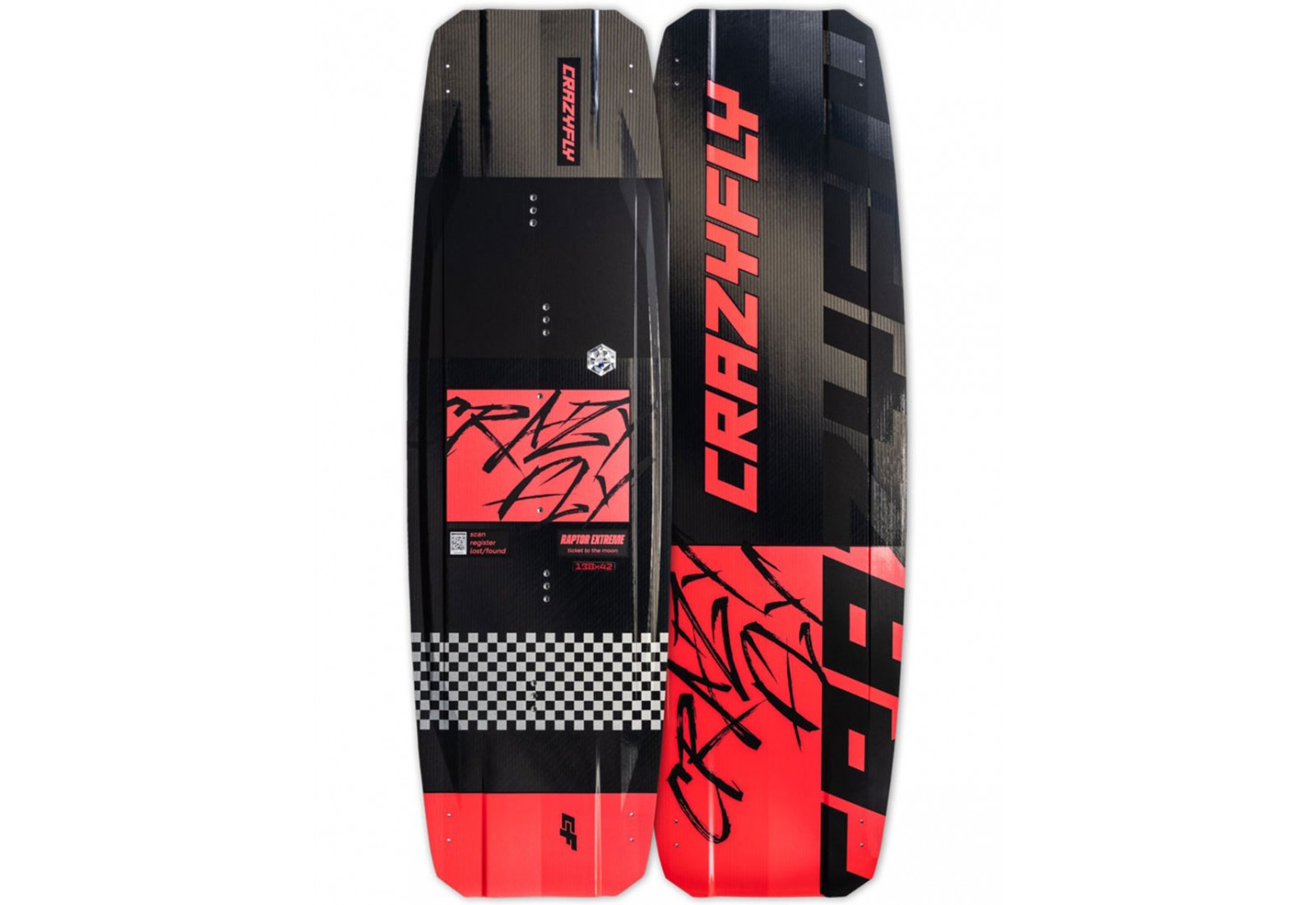 Les inserts invisibles de la planche de kitesurf CrazyFly Raptor Extreme 2026 sont innovants et créent une surface lisse et unifiée sur le dessous de la planche.